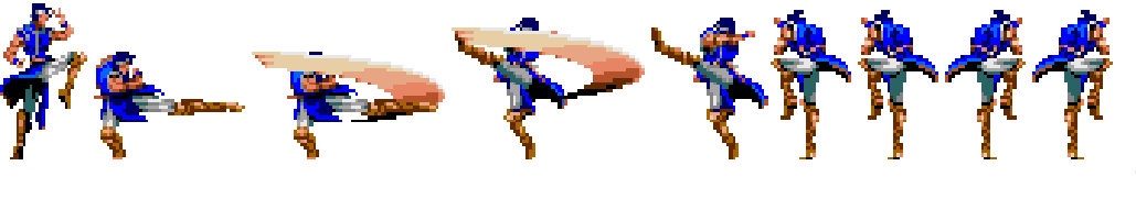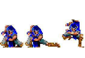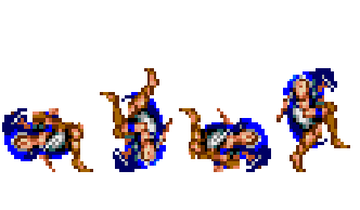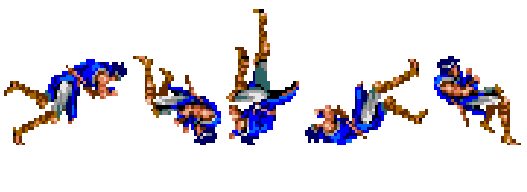 Richter was to have a midair somersault move. What would happen, I guess, is that a jump executed while running would result in Richter flipping through the air--similar to how Samus Aran flips off of momentum in the Metroid games. While it would have been a nice evasive maneuver, it's difficult to tell how you would unleash a whip snap while within this animation. (The individual frames were sent in by Hiro1112.)