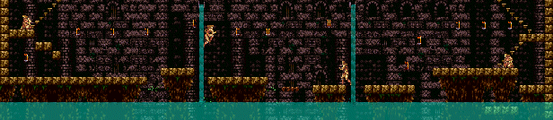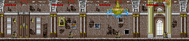 This is the prototype for the castle entrance: (1) A first main hall with scattered platforms and stairways. The background has a stone wall that shows signs of age, a unique window design, and many curtains lining the pillars that hold up the ceiling. Enemies that usually lurk here are zombies, bats and leopards. (2) The second is what I call the "fishman room." Up top, there's a big wall that can only be traveled around from below, using a flooded basement-type area where endless fishmen lurk. The big wall usually can be broken somewhat to find a power-up. (3) From the other side of the big wall, you'll enter into another hall that's reminiscent of the first. It of course contains all of the same features.