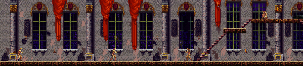 It's not an exact remake of that same level, but it's definitely the same idea. The red worn-out curtains, pillars and square windows are back, but the distance between pillars fluctuates between 4 and 6, and there are two statues built into the background. Zombies and axe knights will block your path. This is clearly not a typical reconstruction of the main halls and exists only as a token reminder of its root.
