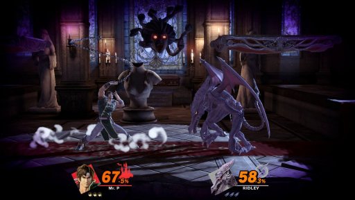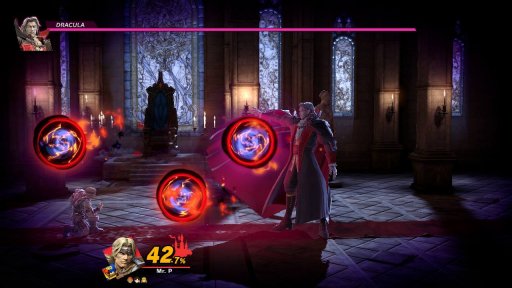 Finally, you can play through Simon and Richter's specially tailored Classic Mode routes. Simon's is called "Smash-vania," wherein he takes on the roster's more-monstrous-looking members--anywhere from one to three of them at a time--and then aims to establish vampire-hunter supremacy by defeating Richter to a solo battle. At the route's end, he fights Dracula in the two-phase battle previously described. Richter's route is called "Smash Echoes," which pits him against fellow Echo Fighters like Dark Samus and Chrom; his route, too, culminates with that same Dracula battle.