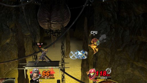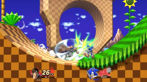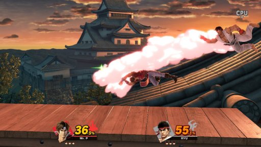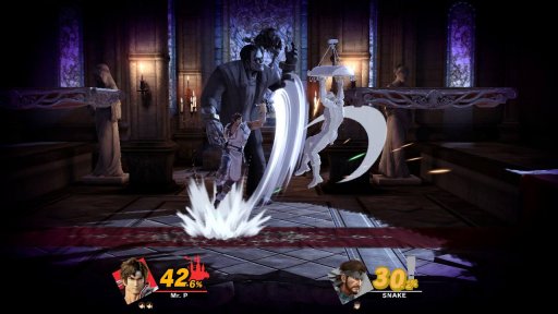 A couple of their attacks, you may notice, are taken directly from the moveset of Richter as he performed in Symphony of the Night's "Richter Mode." Their up-B attack/recovery move is the long-traveling Super Jump--the same uppercut-type maneuver that inflicted damage and allowed him greater accessibility. Their dash attack is the whip-twirling charge, which is a repurposed, grounded version of his horizontal air-dash. Their down-tilt is the very same two-step slide-to-vault kick. And their down-aerial attack is the diagonally-aimed darting jumpkick, which as it did previously allows them to strike at and rebound off of foes' heads and buy enough air to deliver follow-up attacks. All of their other moves are unique to Ultimate. This is true of their Final Smash, wherein they force one or multiple foes into a coffin, wrap the Vampire Killer around it, toss it high up into the air, and then destroy it with a cross-powered item-crash. Greeting them on the victory screen is the stage-clearing music from Castlevania and Rondo; it's there where either will strike one of his three victory poses (the most faithful of which is Simon's continually-jump-and-whip motion, which is a play on what he does in Castlevania if you hold the button down after collecting the stage-clearing orb) and let loose a verbal taunt.