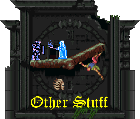 What's new?- Click here to see what's been added or updated recently. Also, come on in to see how you can be an integral part of "Mr. P's Castlevania Realm." All of this plus other information you'll need to contact me lurk inside. CV Library- The Castlevania Library is home to an abundance of information on the characters, the story and the series' background plus it's occupied by all other types of reading material. So get your card stamped and enter the library. Watch out for those Schmoos. The Stages- Want to have a look at what lurks ahead when you insert that Castlevania game into your system? This link will lead you to detailed stage listings and whole stage maps. The