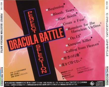From the contributor, Soul Spawn 81: "I think that you already know about the existence of the Konami music group called 'Kukeiha Club,' whose work includes arranged and recomposed classic tunes, like those from Castlevania. In 1994, they made a CD called Dracula Battle Perfect Selection Vol. 1, which highlights entries from Castlevania, Haunted Castle, Simon's Quest, Dracula's Curse, Belmont's Revenge, Bloodlines and Dracula X: Rondo of Blood." To listen to these tunes, click here.