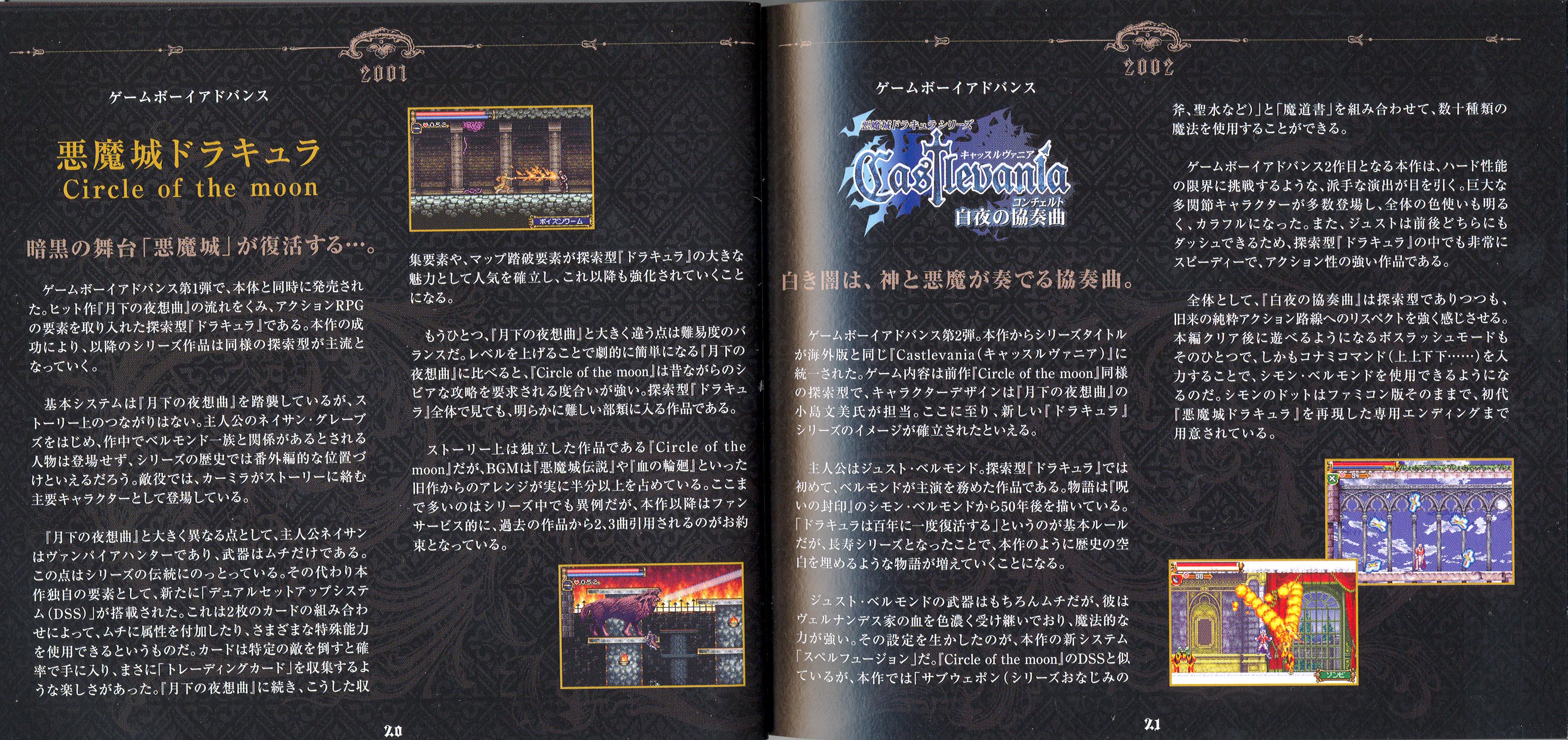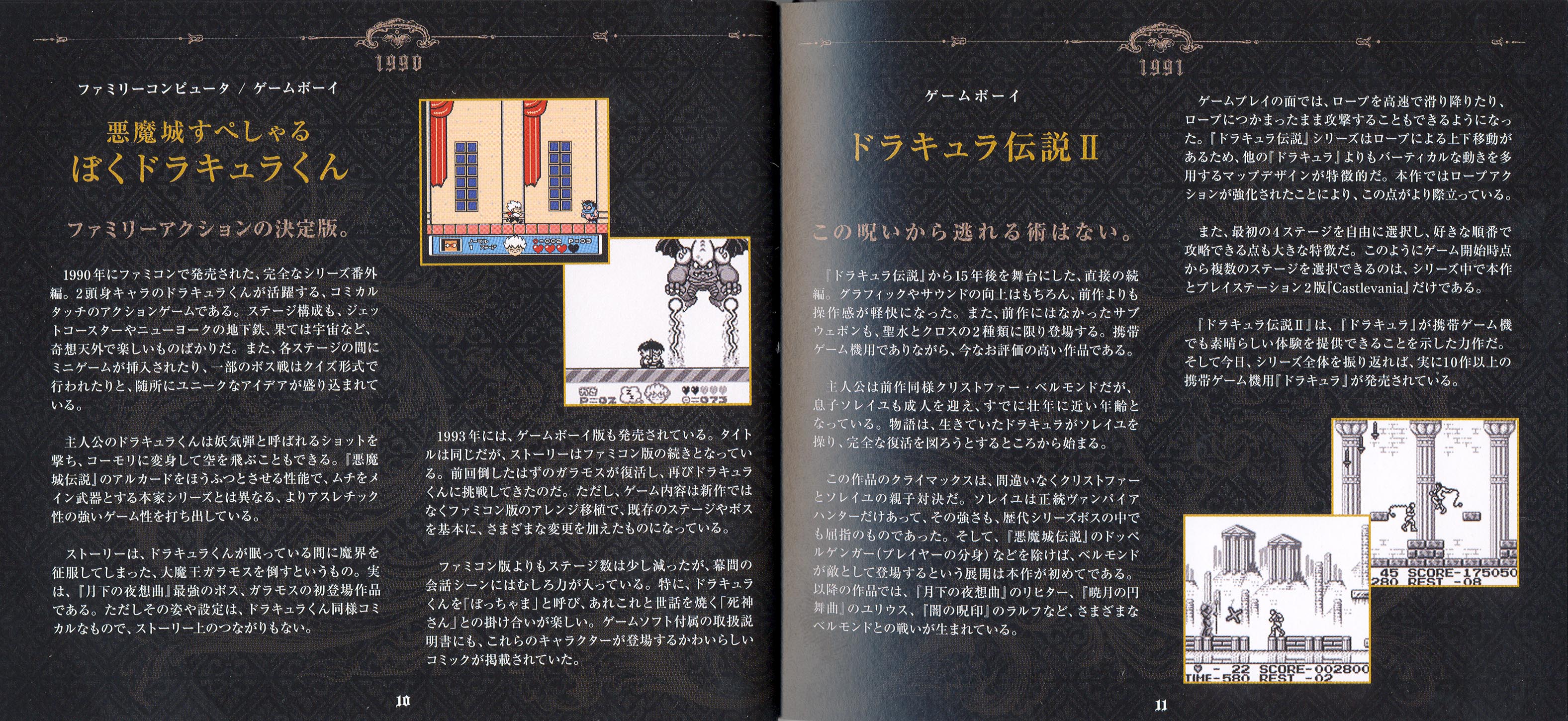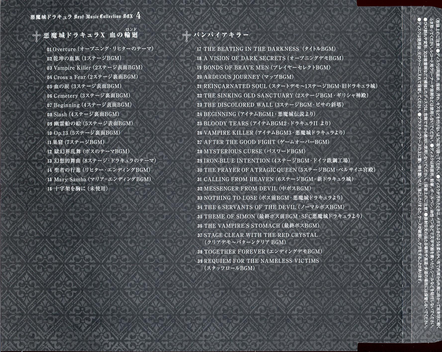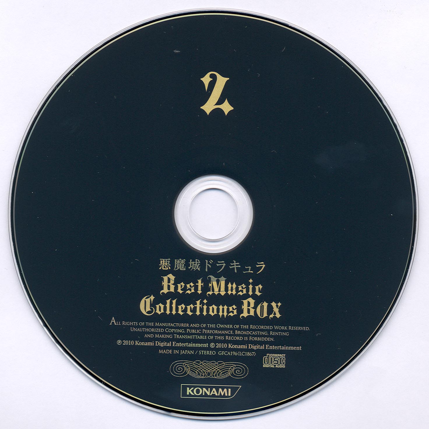 Castlevania Best Music Collections Box, released in 2010, is what fans have been waiting for: A multi-disc soundtrack compilation covering the excellent musical scores that have accompanied each and every title in the long-enduring Castlevania series, from the much-celebrated inaugral entry Castlevania (1986) to Castlevania: The Arcade (2009), which never saw western release; present, too, are soundtracks to related/offshoot titles like Vampire Killer, Kid Dracula and Castlevania: The Medal. Measuring in at 18 CDs, Collections Box features remastered tunes as taken directly from the games of origin plus a selection of remixed/original tunes created by Michiru Yamane, who in addition is interviewed in a special bonus DVD. Collections Box is, for now, available only in Japan.
