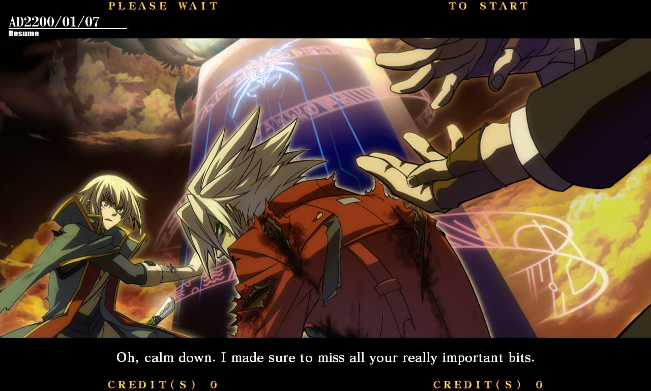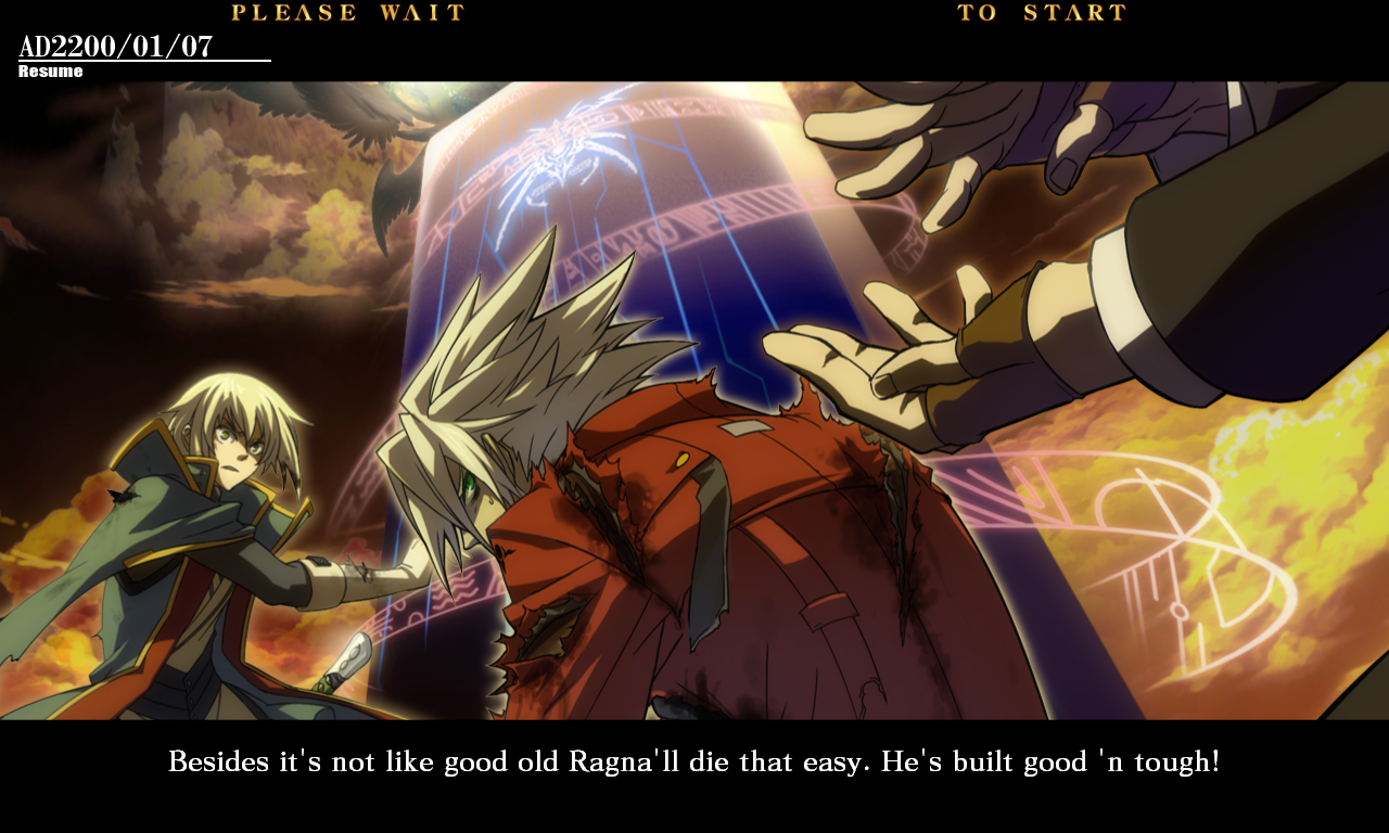 | Ragna The Bloodedge | - Jin Kisaragi - | Rachel Alucard | Carl Clover | Arakune | Bang Shishigami | | Haku-Men | Tsubaki Yayoi | Noel Vermillion | Λ-11- | Iron Tager | Litchi Faye Ling | Taokaka | Hazama | | - Arcade Mode - | Score Attack | |