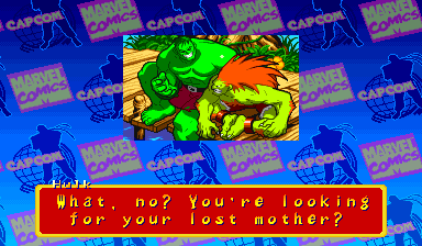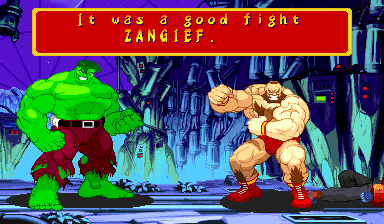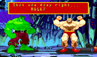 | Ryu | Captain America | U.S.Agent | Ken | Wolverine | Chun-Li | Spider-Man | Armored Spider-Man | Dhalsim | Zangief | Mech-Zangief | | Sakura | Sunburned Sakura | Dan | Cyclops | - Hulk - | Shadow | Omega Red | Shuma-Gorath | Blackheart | Mephisto | M.Bison | Akuma | Norimaro (Japanese Version) | |