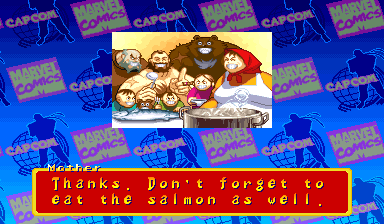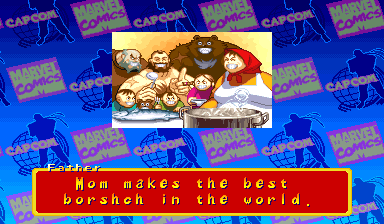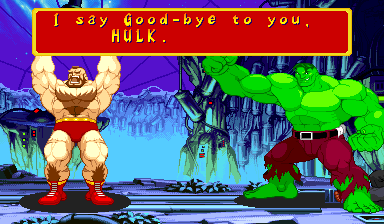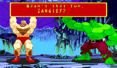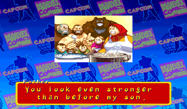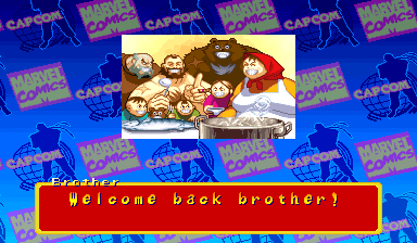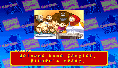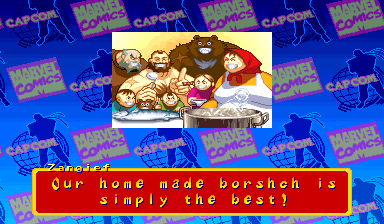 | Ryu | Captain America | U.S.Agent | Ken | Wolverine | Chun-Li | Spider-Man | Armored Spider-Man | Dhalsim | - Zangief - | Mech-Zangief | | Sakura | Sunburned Sakura | Dan | Cyclops | Hulk | Shadow | Omega Red | Shuma-Gorath | Blackheart | Mephisto | M.Bison | Akuma | Norimaro (Japanese Version) | |