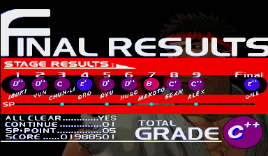 | Remy | - Ryu - | Ken | Chun-Li | Sean | Ibuki | Yun | Yang | Alex | Makoto | | Necro | Oro | Elena | Dudley | Q | Urien | Twelve | Hugo | Akuma | |