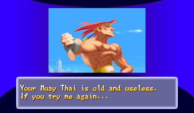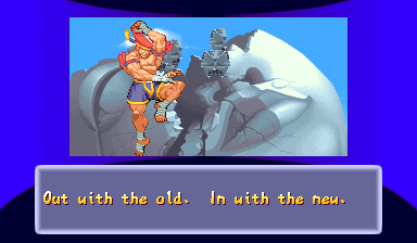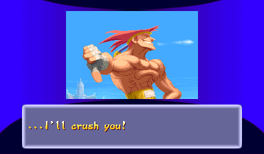 | Ryu | Ken | Charlie | Chun Li | Sakura | Zangief | Rose | Dhalsim | Gen | | Sodom | Dan | - Adon - | Birdie | Guy | Rolento | Sagat | M.Bison | Akuma | |