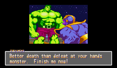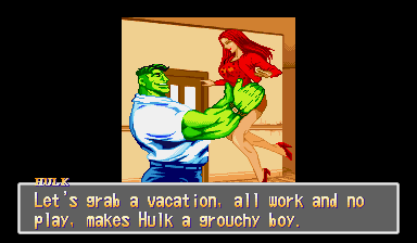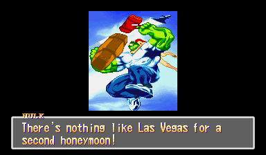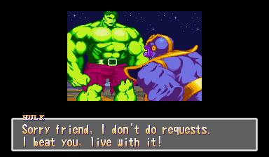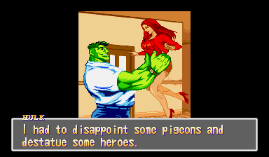 | Spiderman | Captain America | Wolverine | - Hulk - | Iron Man | | Psylocke | Shuma-Gorath | Blackheart | Juggernaut | Magneto | |
