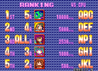 | Bub | Musashi | - Luna Luna - | Chinkulu | | Malissa | Jack | Pulichio | Sonic Blast Man | | - Normal/Hard - | Easy | | Puzzle Mode | - Vs. Mode - | |