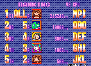 | Bub | Musashi | Luna Luna | Chinkulu | | - Malissa - | Jack | Pulichio | Sonic Blast Man | | - Normal/Hard - | Easy | | Puzzle Mode | - Vs. Mode - | |