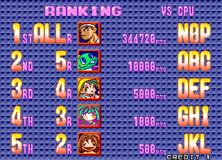 | Bub | - Musashi - | Luna Luna | Chinkulu | | Malissa | Jack | Pulichio | Sonic Blast Man | | - Normal/Hard - | Easy | | Puzzle Mode | - Vs. Mode - | |