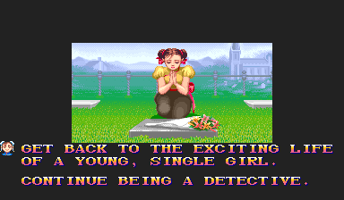 [ Get Back To Being A Single Girl ] [ Continue Being A Detective ] | Ryu | Ken | - Chun Li - | Guile | Blanka | Zangief | Dhalsim | E.Honda | | Cammy | Dee Jay | T.Hawk | Fei Long | Balrog | Vega | Sagat | M.Bison | |