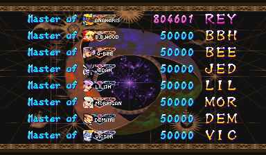 | Demitri | Felicia | J.Talbain | L.Rapter | B.B.Hood | Hsien-Ko | Q-Bee | | - Anakaris - | Sasquatch | Victor | Rikuo | Bishamon | Lilith | Morrigan | Jedah | | - Normal Mode - | Shadow Mode | |