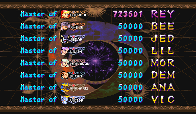 | Demitri | Felicia | J.Talbain | L.Rapter | - B.B.Hood - | Hsien-Ko | Q-Bee | | Anakaris | Sasquatch | Victor | Rikuo | Bishamon | Lilith | Morrigan | Jedah | | - Normal Mode - | Shadow Mode | |