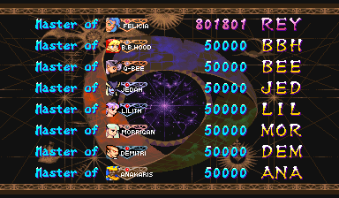 | Demitri | - Felicia - | J.Talbain | L.Rapter | B.B.Hood | Hsien-Ko | Q-Bee | | Anakaris | Sasquatch | Victor | Rikuo | Bishamon | Lilith | Morrigan | Jedah | | - Normal Mode - | Shadow Mode | |
