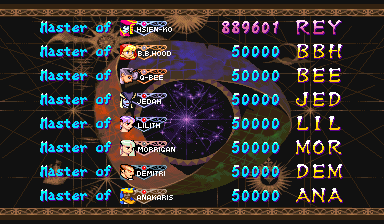 | Demitri | Felicia | J.Talbain | L.Rapter | B.B.Hood | - Hsien-Ko - | Q-Bee | | Anakaris | Sasquatch | Victor | Rikuo | Bishamon | Lilith | Morrigan | Jedah | | - Normal Mode - | Shadow Mode | |