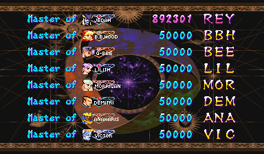 | Demitri | Felicia | J.Talbain | L.Rapter | B.B.Hood | Hsien-Ko | Q-Bee | | Anakaris | Sasquatch | Victor | Rikuo | Bishamon | Lilith | Morrigan | - Jedah - | | - Normal Mode - | Shadow Mode | |