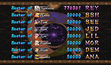 | Demitri | Felicia | J.Talbain | L.Rapter | B.B.Hood | Hsien-Ko | Q-Bee | | Anakaris | - Sasquatch - | Victor | Rikuo | Bishamon | Lilith | Morrigan | Jedah | | - Normal Mode - | Shadow Mode | |