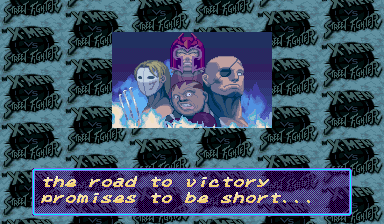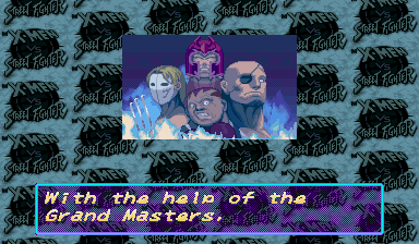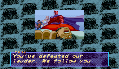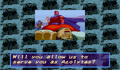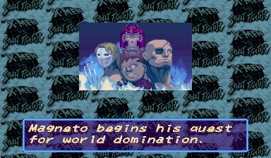 | Ryu | Cyclops | Ken | Rogue | Dhalsim | Chun Li | Storm | Zangief | Cammy | Charlie | | Gambit | Wolverine | Sabretooth | Juggernaut | - Magneto - | Akuma | M.Bison | |