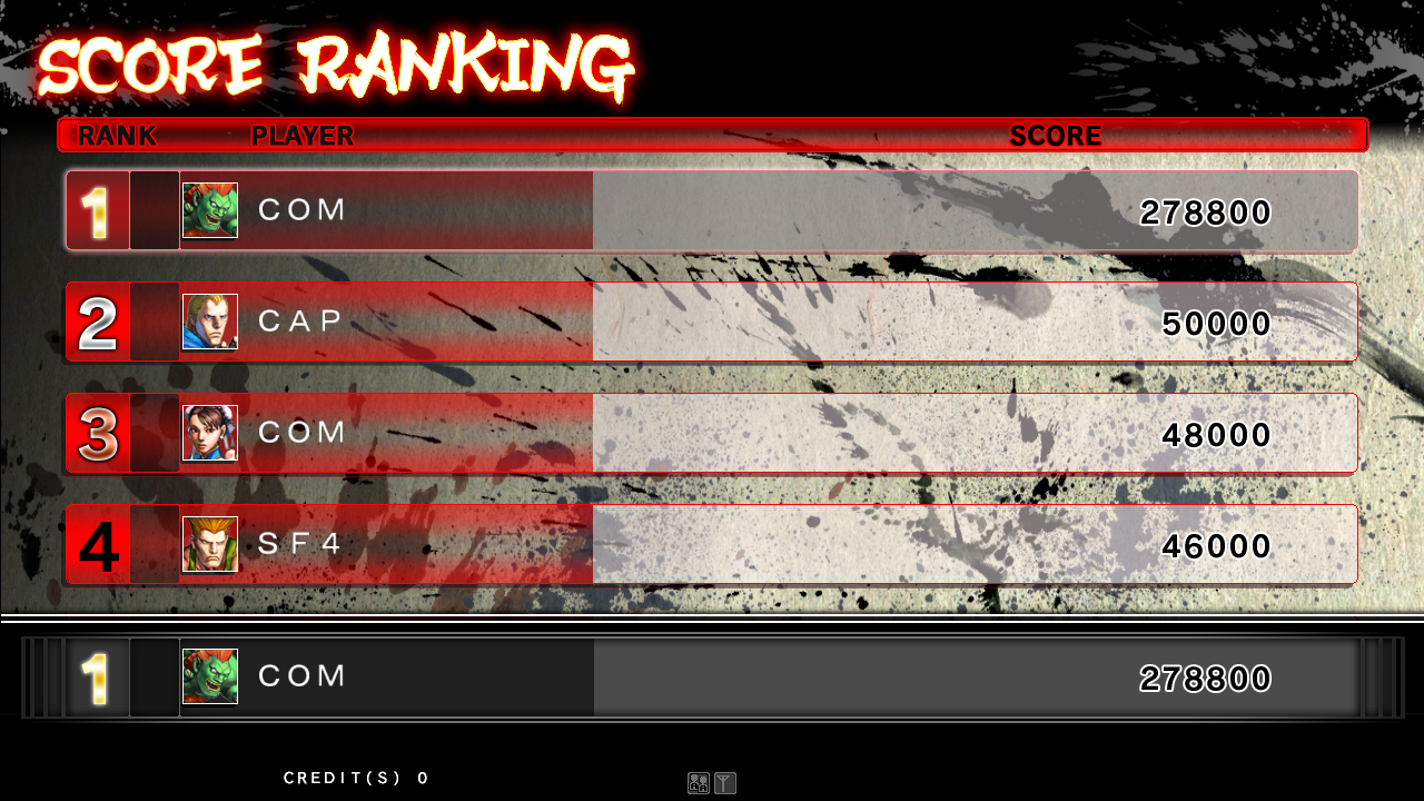 | Ryu | Dhalsim | - Blanka - | Chun-Li | E.Honda | Zangief | Guile | Ken | M.Bison | Sagat | Vega | Balrog | Abel | C.Viper | Rufus | El Fuerte | Akuma | | - If Seth Was The Last Boss - | If Akuma Was The Last Boss | If Gouken Was The Last Boss | | - Arcade Mode - | Trial Mode | |
