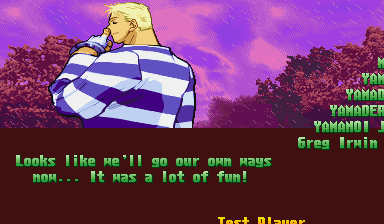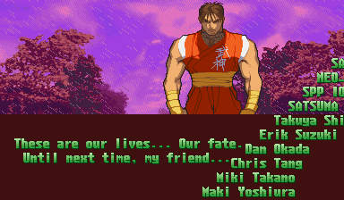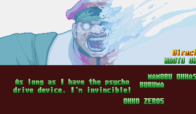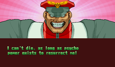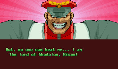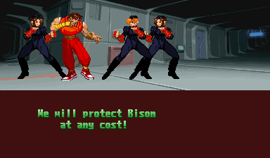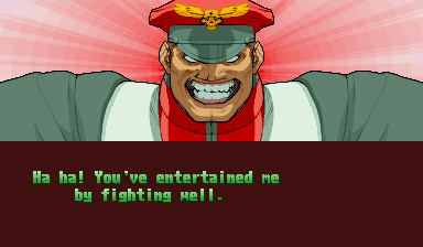 | - Good Endings - | Bad Ending | | Ryu | Ken | Charlie | Chun Li | Guy | - Cody - | Blanka | Dhalsim | E.Honda | Gen | Karin | R.Mika | Rolento | Rose | | Sakura | Sodom | Zangief | Dan | Cammy | Birdie | Adon | Vega | Sagat | Akuma | M.Bison | |