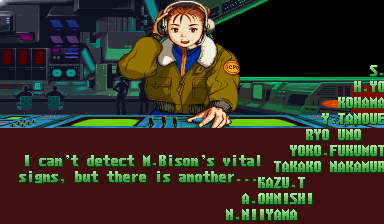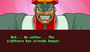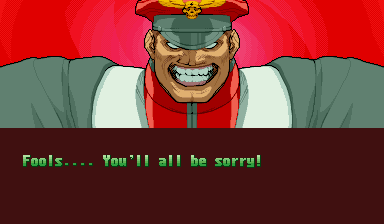 | - Good Endings - | Bad Ending | | Ryu | Ken | Charlie | Chun Li | Guy | Cody | Blanka | - Dhalsim - | E.Honda | Gen | Karin | R.Mika | Rolento | Rose | | Sakura | Sodom | Zangief | Dan | Cammy | Birdie | Adon | Vega | Sagat | Akuma | M.Bison | |