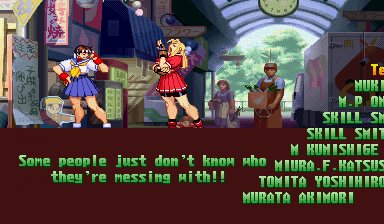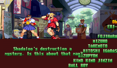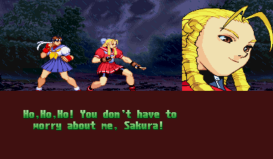 | - Good Endings - | Bad Ending | | Ryu | Ken | Charlie | Chun Li | Guy | Cody | Blanka | Dhalsim | E.Honda | Gen | - Karin - | R.Mika | Rolento | Rose | | Sakura | Sodom | Zangief | Dan | Cammy | Birdie | Adon | Vega | Sagat | Akuma | M.Bison | |