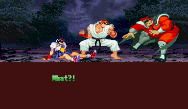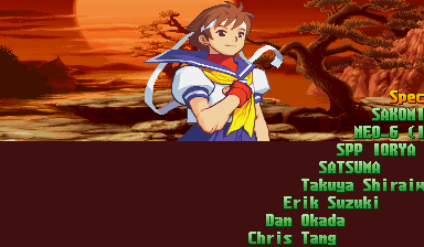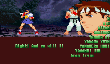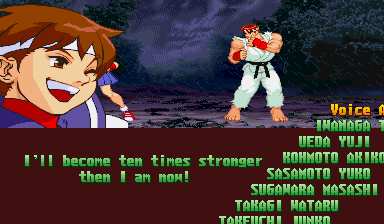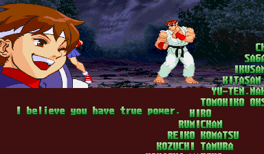 | - Good Endings - | Bad Ending | | Ryu | Ken | Charlie | Chun Li | Guy | Cody | Blanka | Dhalsim | E.Honda | Gen | Karin | R.Mika | Rolento | Rose | | - Sakura - | Sodom | Zangief | Dan | Cammy | Birdie | Adon | Vega | Sagat | Akuma | M.Bison | |