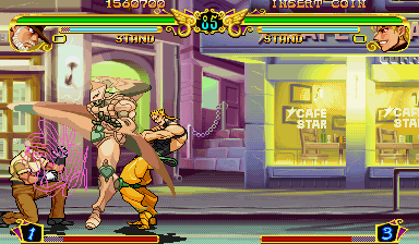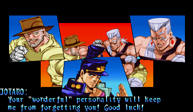 | Jotaro | Polnareff | - Joseph - | Kakyoin | Iggi | Midler | Alessy | | D'Bo | Avdol | Chaca | Dio | Young Joseph | Shadow Dio | |