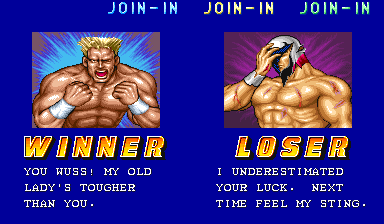 | Biff | Grater | - Gunloc - | Haggar | Oni | Rasta | Stingr | Titan | | - 1st Run - | 2nd Run | | - Single Match - | Team Battle Royal | |