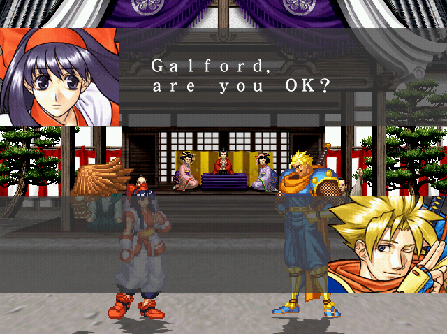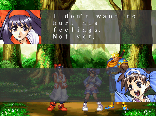 | Andrew | Amakusa | Basara | Cham Cham | Charlotte | Earthquake | Enja | Gaira | Galford | Gaoh | Gen-An | Genjuro | Hanzo | Haohmaru | Iroha | Jubei | Kazuki | Kusaregedo | Kyoshiro | Mina | | Mizuki | - Nakoruru - | Nicotine | Ocha-Maro | Rasetsumaru | Rera | Rimururu | Sankuro | Shizumaru | Sieger | Sogetsu | Sugoroku | Suija | Tam Tam | Ukyo | Wan-Fu | Yoshitora | Yumeji | Yunfei | Zankuro | |