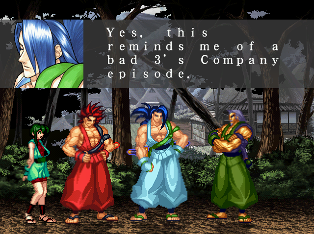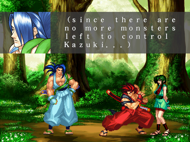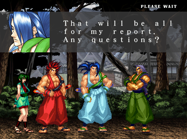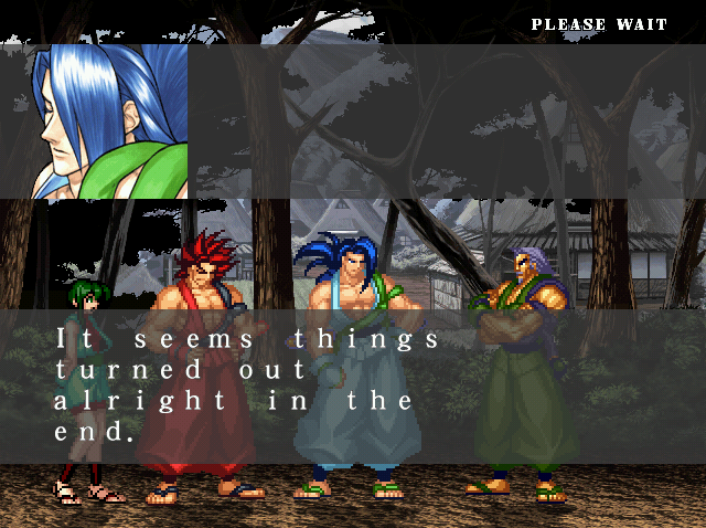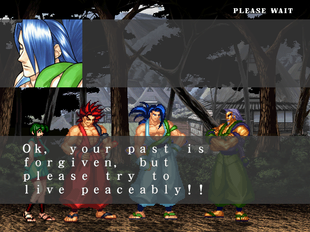 | Andrew | Amakusa | Basara | Cham Cham | Charlotte | Earthquake | Enja | Gaira | Galford | Gaoh | Gen-An | Genjuro | Hanzo | Haohmaru | Iroha | Jubei | Kazuki | Kusaregedo | Kyoshiro | Mina | | Mizuki | Nakoruru | Nicotine | Ocha-Maro | Rasetsumaru | Rera | Rimururu | Sankuro | Shizumaru | Sieger | - Sogetsu - | Sugoroku | Suija | Tam Tam | Ukyo | Wan-Fu | Yoshitora | Yumeji | Yunfei | Zankuro | |