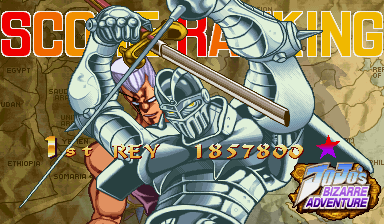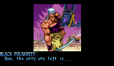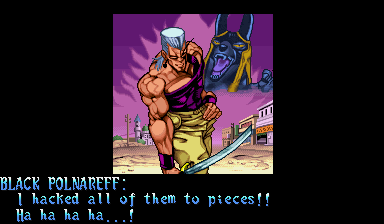 | Joseph | Jotaro | Avdol | Iggi | Mahrahia | Chaca | Petshop | - Black Polnareff - | Holhorse | Midler | Kakyoin | Dio | | Iced | D'Bo | Alessy | Polnareff | Jojo | Robber Soul | Holhorse & Voing | New Kakyoin | Kan | Shadow Dio | |