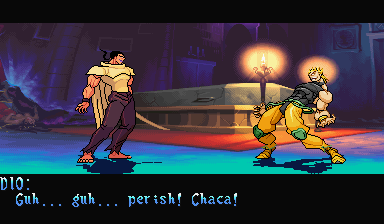 | Joseph | Jotaro | Avdol | Iggi | Mahrahia | - Chaca - | Petshop | Black Polnareff | Holhorse | Midler | Kakyoin | Dio | | Iced | D'Bo | Alessy | Polnareff | Jojo | Robber Soul | Holhorse & Voing | New Kakyoin | Kan | Shadow Dio | |