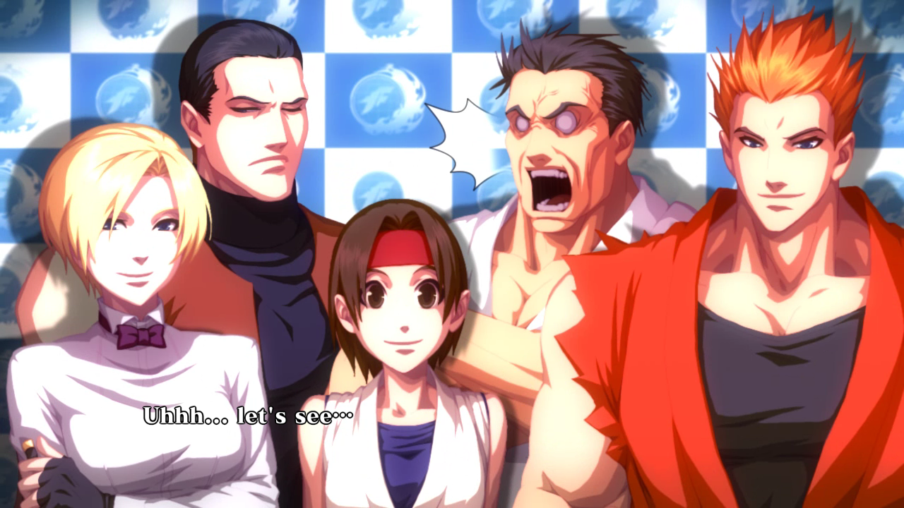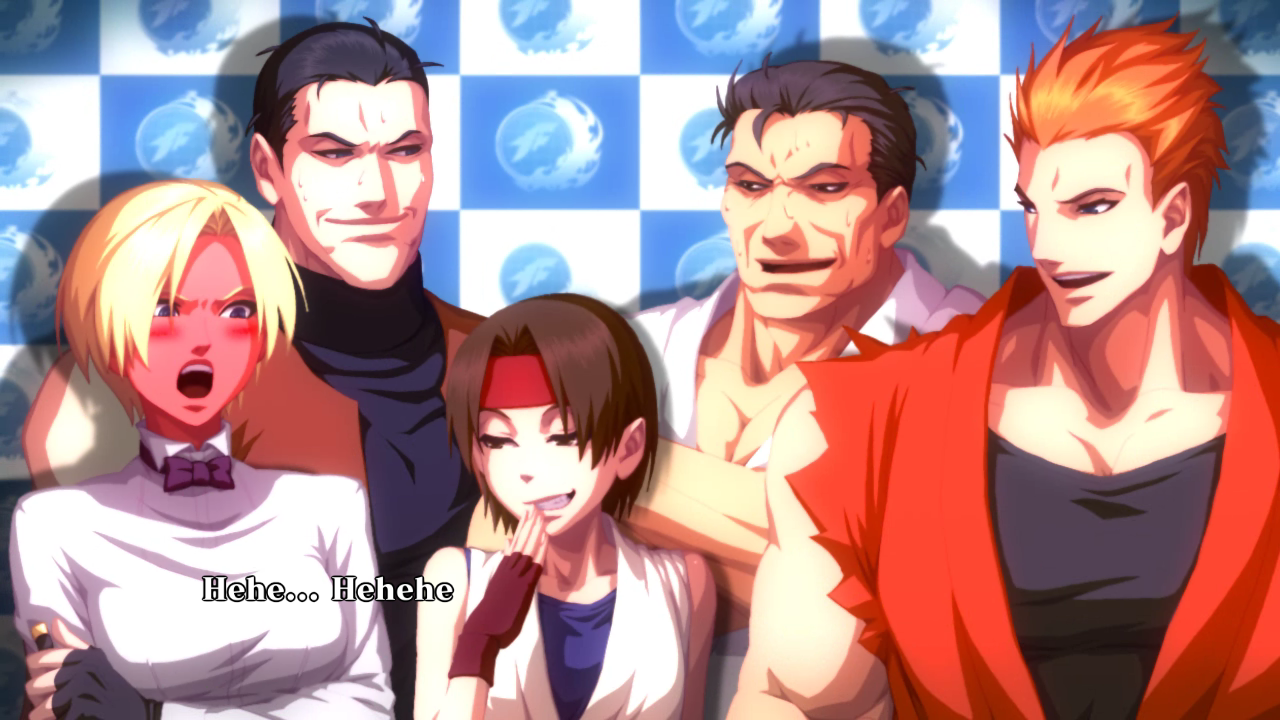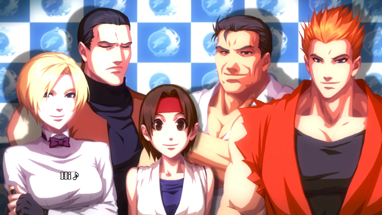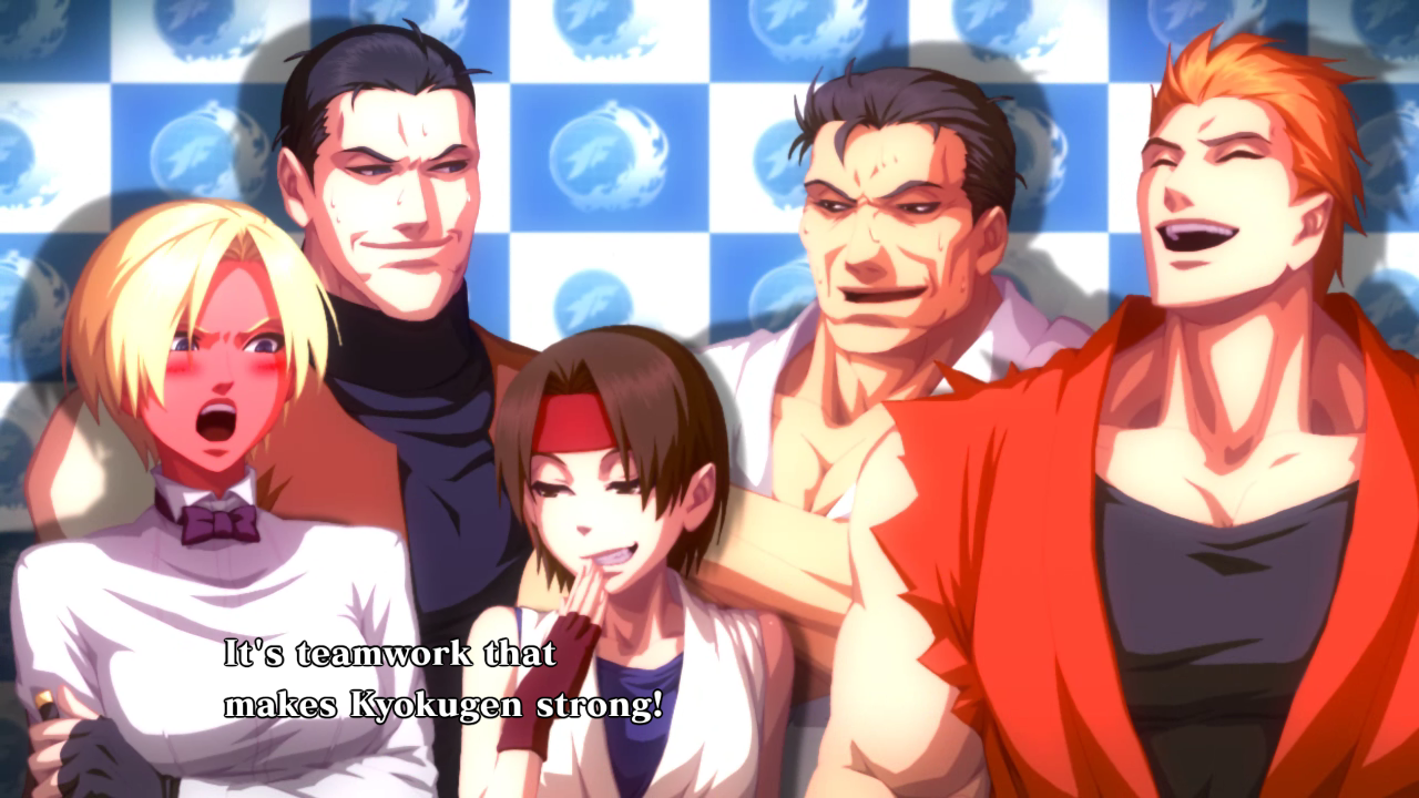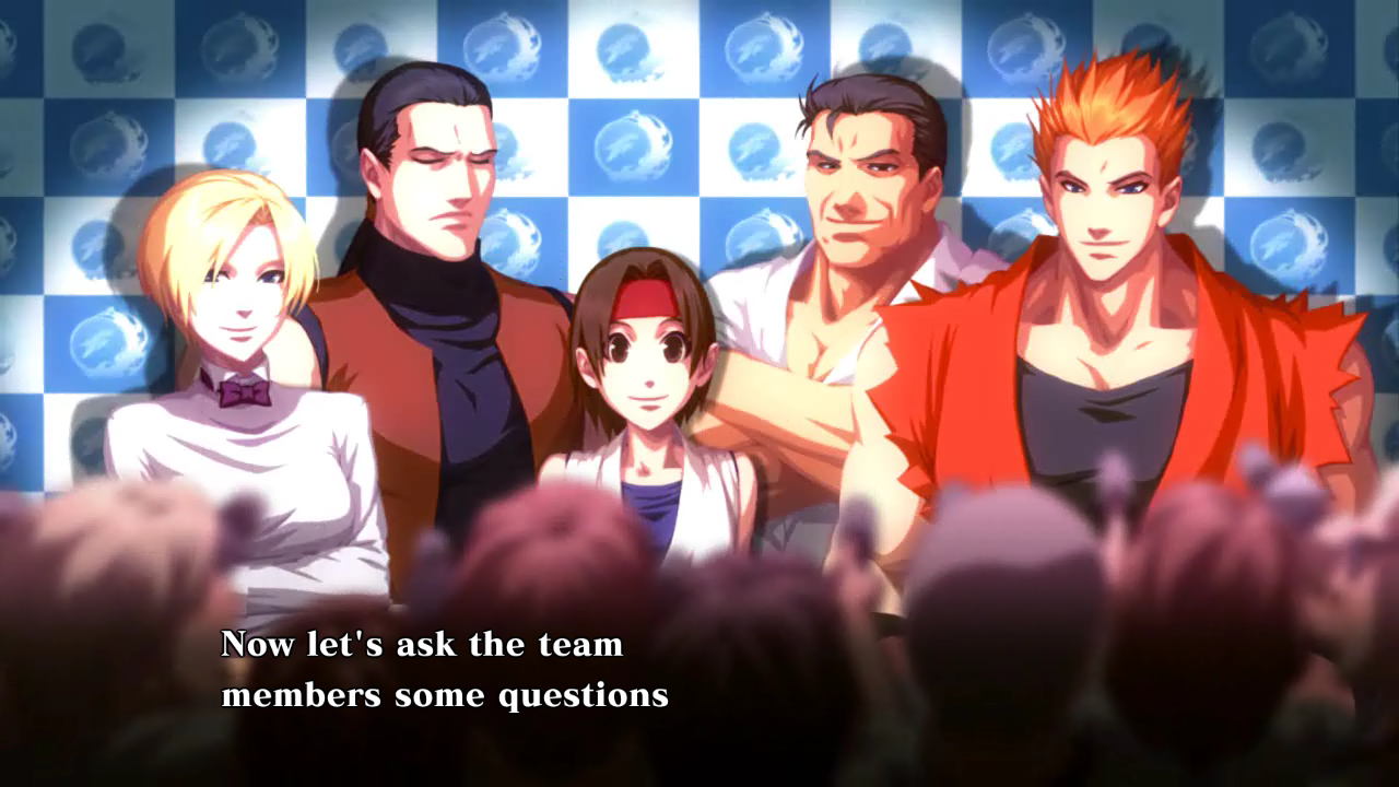 | Japan Team: Kyo, Benimaru, Daimon | Fatal Fury Team: Terry, Andy, Joe | - Art of Fighting Team: Ryo, Robert, Takuma - | Iori Team: Iori, Vice, Mature | Elisabeth Team: Elisabeth, Duolon, Shen | | Kim Team: Kim, Hwa, Raiden | Women Fighters Team: King, Mai, Yuri | K' Team: K', Kula, Maxima | Psycho Soldier Team: Athena, Kensou, Chin | Ikari Warriors Team: Ralf, Clark, Leona | | - Standard Teams - | Special Teams | Team Edit | | - Good Endings - | Bad Ending | |