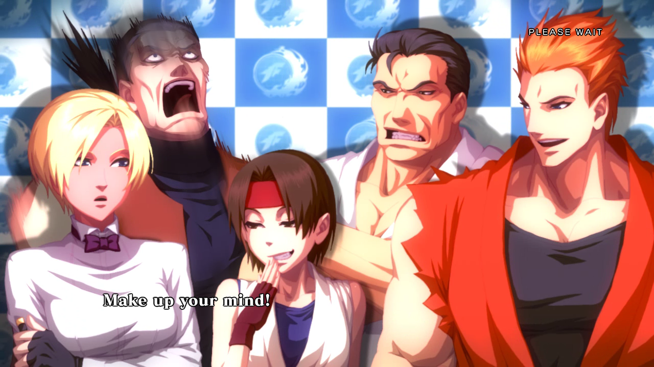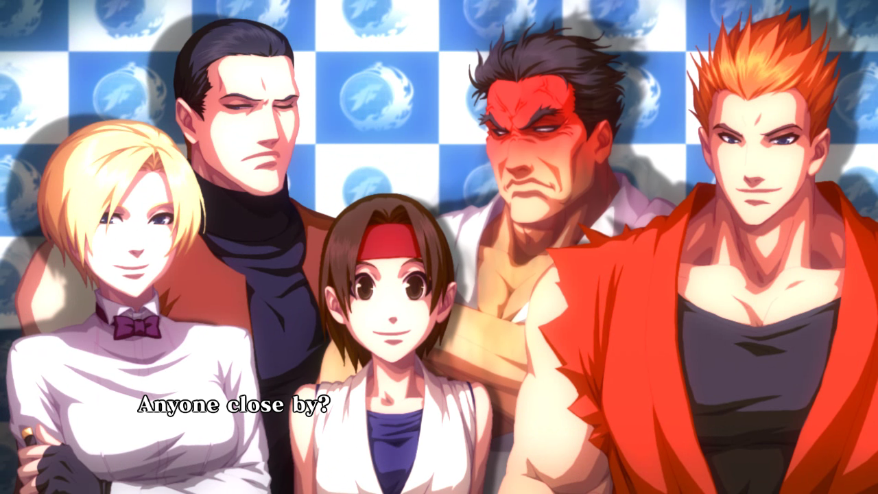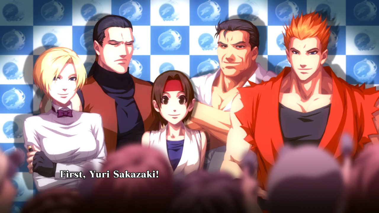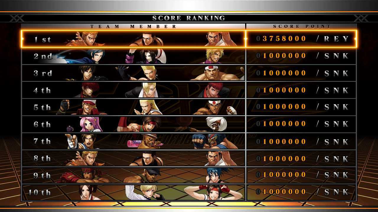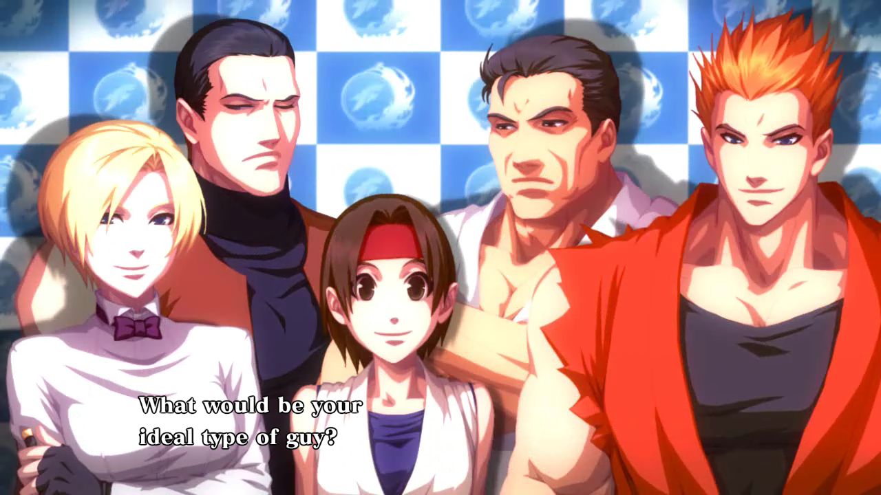 | Japan Team: Kyo, Benimaru, Daimon | Fatal Fury Team: Terry, Andy, Joe | - Art of Fighting Team: Ryo, Robert, Takuma - | Iori Team: Iori, Vice, Mature | Elisabeth Team: Elisabeth, Duolon, Shen | | Kim Team: Kim, Hwa, Raiden | Women Fighters Team: King, Mai, Yuri | K' Team: K', Kula, Maxima | Psycho Soldier Team: Athena, Kensou, Chin | Ikari Warriors Team: Ralf, Clark, Leona | | - Standard Teams - | Special Teams | Team Edit | | - Good Endings - | Bad Ending | |