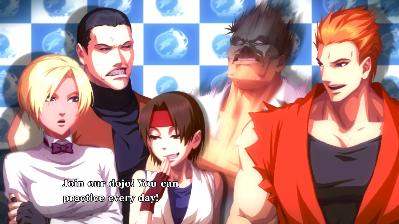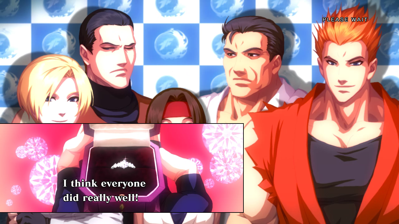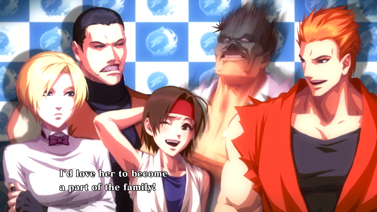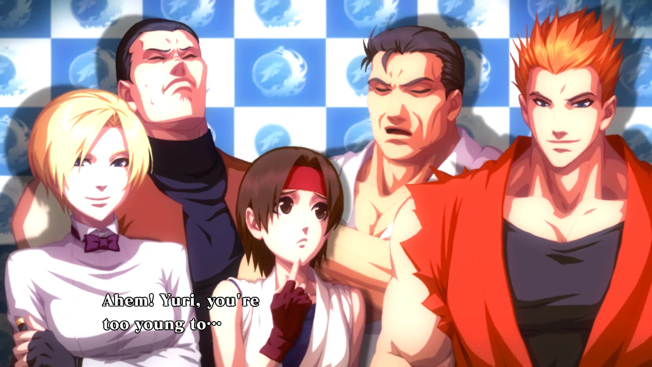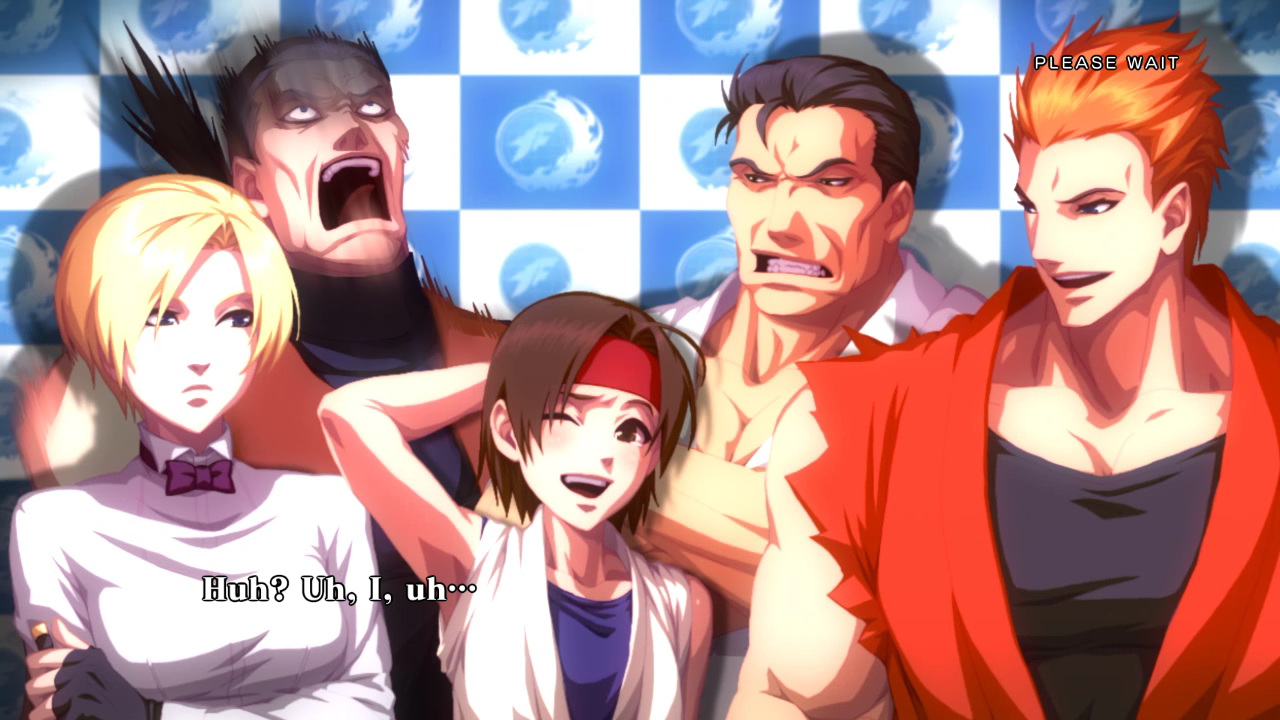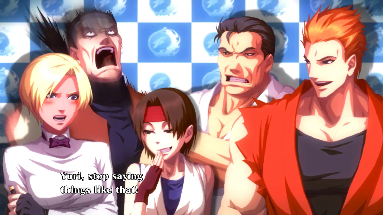 | Japan Team: Kyo, Benimaru, Daimon | Fatal Fury Team: Terry, Andy, Joe | - Art of Fighting Team: Ryo, Robert, Takuma - | Iori Team: Iori, Vice, Mature | Elisabeth Team: Elisabeth, Duolon, Shen | | Kim Team: Kim, Hwa, Raiden | Women Fighters Team: King, Mai, Yuri | K' Team: K', Kula, Maxima | Psycho Soldier Team: Athena, Kensou, Chin | Ikari Warriors Team: Ralf, Clark, Leona | | - Standard Teams - | Special Teams | Team Edit | | - Good Endings - | Bad Ending | |