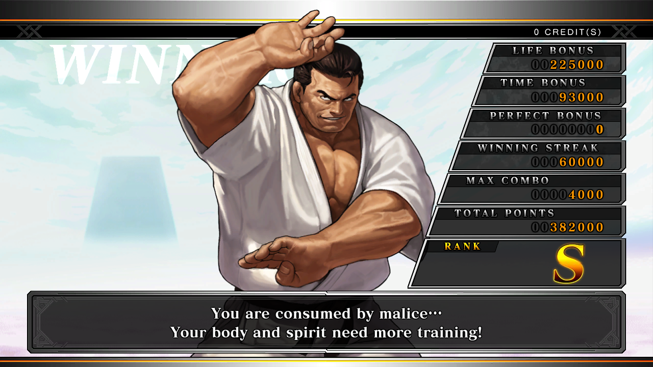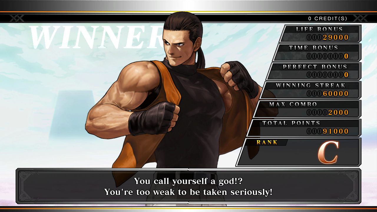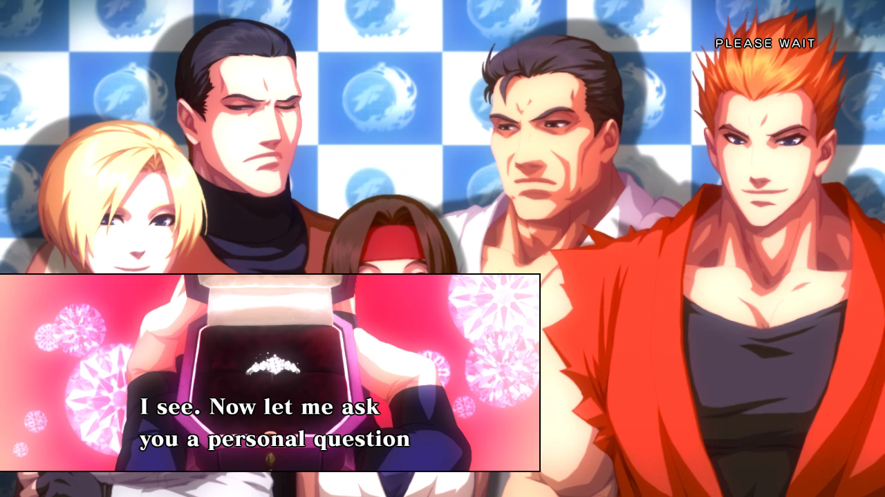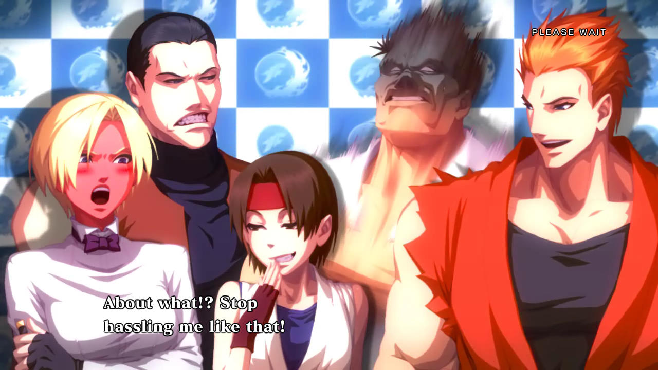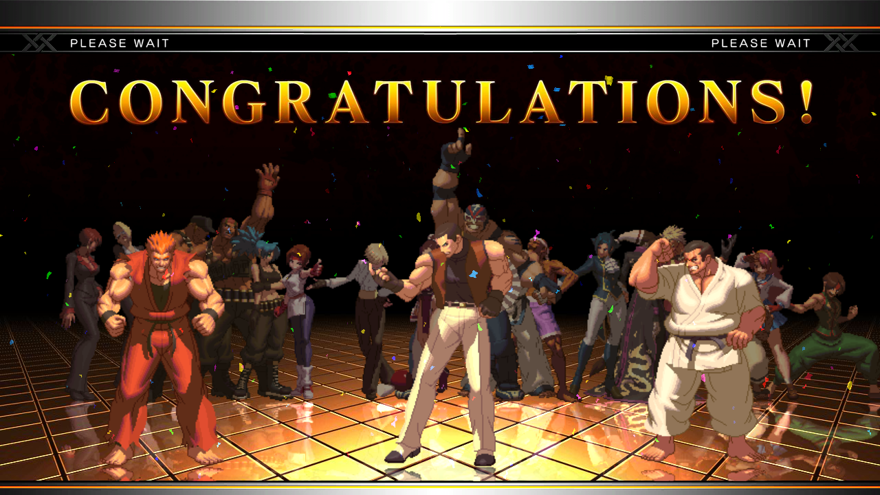| Japan Team: Kyo, Benimaru, Daimon | Fatal Fury Team: Terry, Andy, Joe | - Art of Fighting Team: Ryo, Robert, Takuma - | Iori Team: Iori, Vice, Mature | Elisabeth Team: Elisabeth, Duolon, Shen | | Kim Team: Kim, Hwa, Raiden | Women Fighters Team: King, Mai, Yuri | K' Team: K', Kula, Maxima | Psycho Soldier Team: Athena, Kensou, Chin | Ikari Warriors Team: Ralf, Clark, Leona | | - Standard Teams - | Special Teams | Team Edit | | - Good Endings - | Bad Ending | |