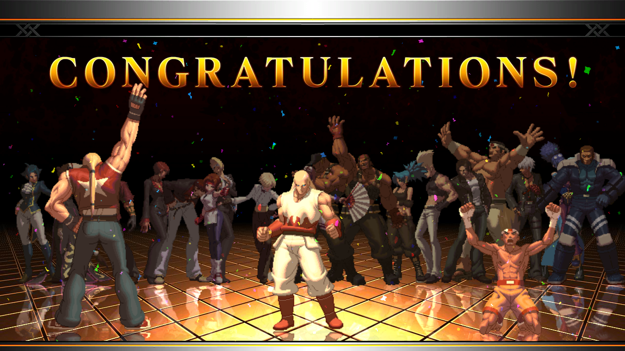 | Japan Team: Kyo, Benimaru, Daimon | - Fatal Fury Team: Terry, Andy, Joe - | Art of Fighting Team: Ryo, Robert, Takuma | Iori Team: Iori, Vice, Mature | Elisabeth Team: Elisabeth, Duolon, Shen | | Kim Team: Kim, Hwa, Raiden | Women Fighters Team: King, Mai, Yuri | K' Team: K', Kula, Maxima | Psycho Soldier Team: Athena, Kensou, Chin | Ikari Warriors Team: Ralf, Clark, Leona | | - Standard Teams - | Special Teams | Team Edit | | - Good Endings - | Bad Ending | |
