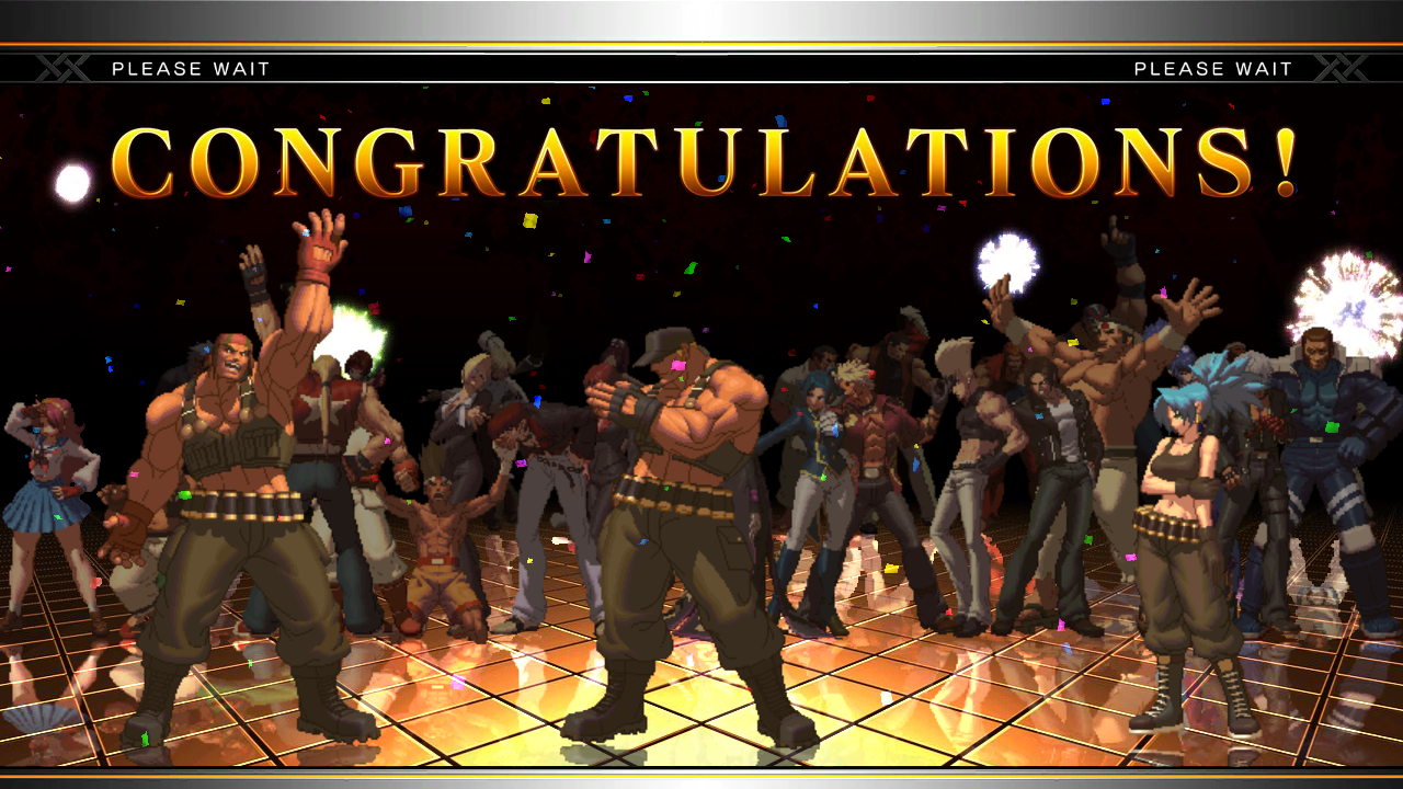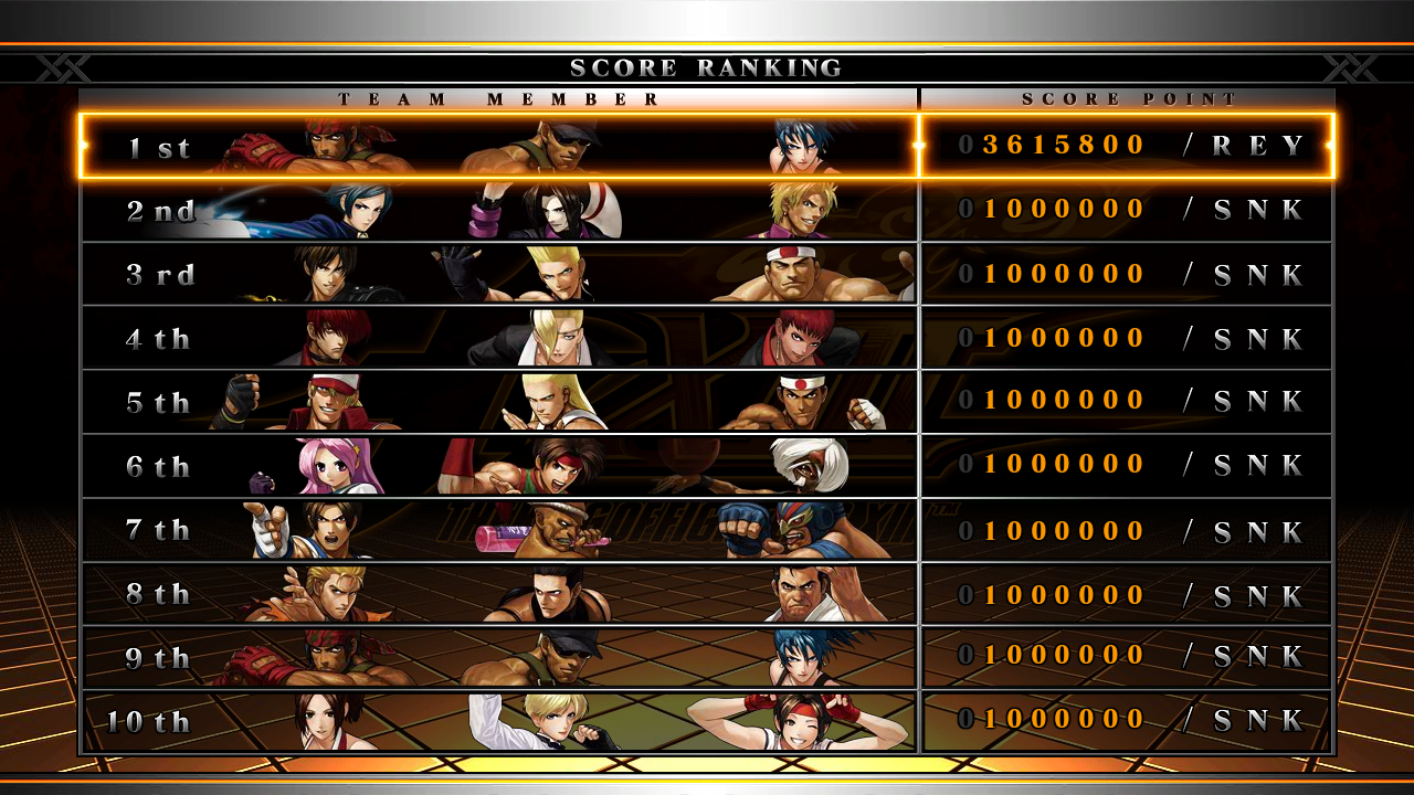 | Japan Team: Kyo, Benimaru, Daimon | Fatal Fury Team: Terry, Andy, Joe | Art of Fighting Team: Ryo, Robert, Takuma | Iori Team: Iori, Vice, Mature | Elisabeth Team: Elisabeth, Duolon, Shen | | Kim Team: Kim, Hwa, Raiden | Women Fighters Team: King, Mai, Yuri | K' Team: K', Kula, Maxima | Psycho Soldier Team: Athena, Kensou, Chin | - Ikari Warriors Team: Ralf, Clark, Leona - | | - Standard Teams - | Special Teams | Team Edit | | - Good Endings - | Bad Ending | |