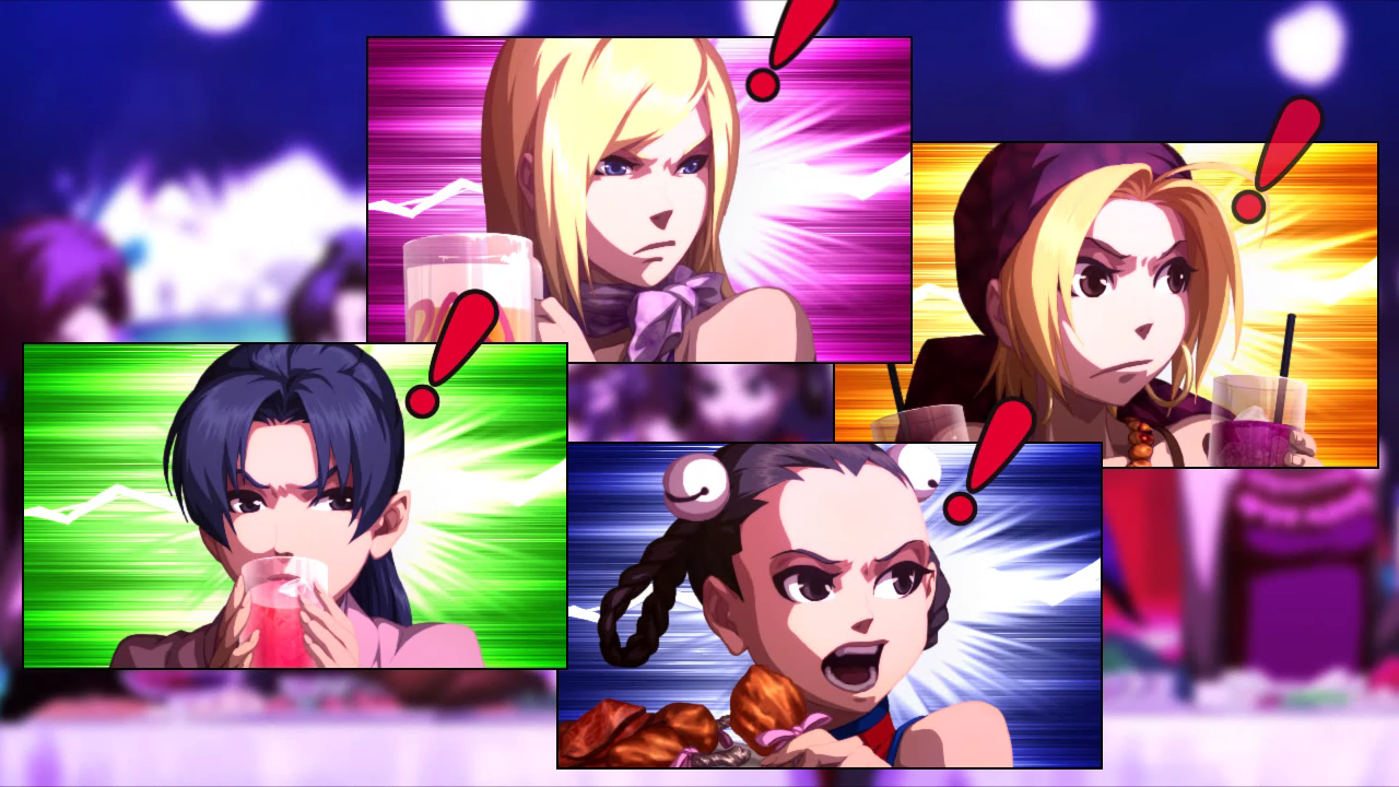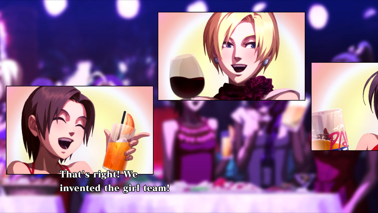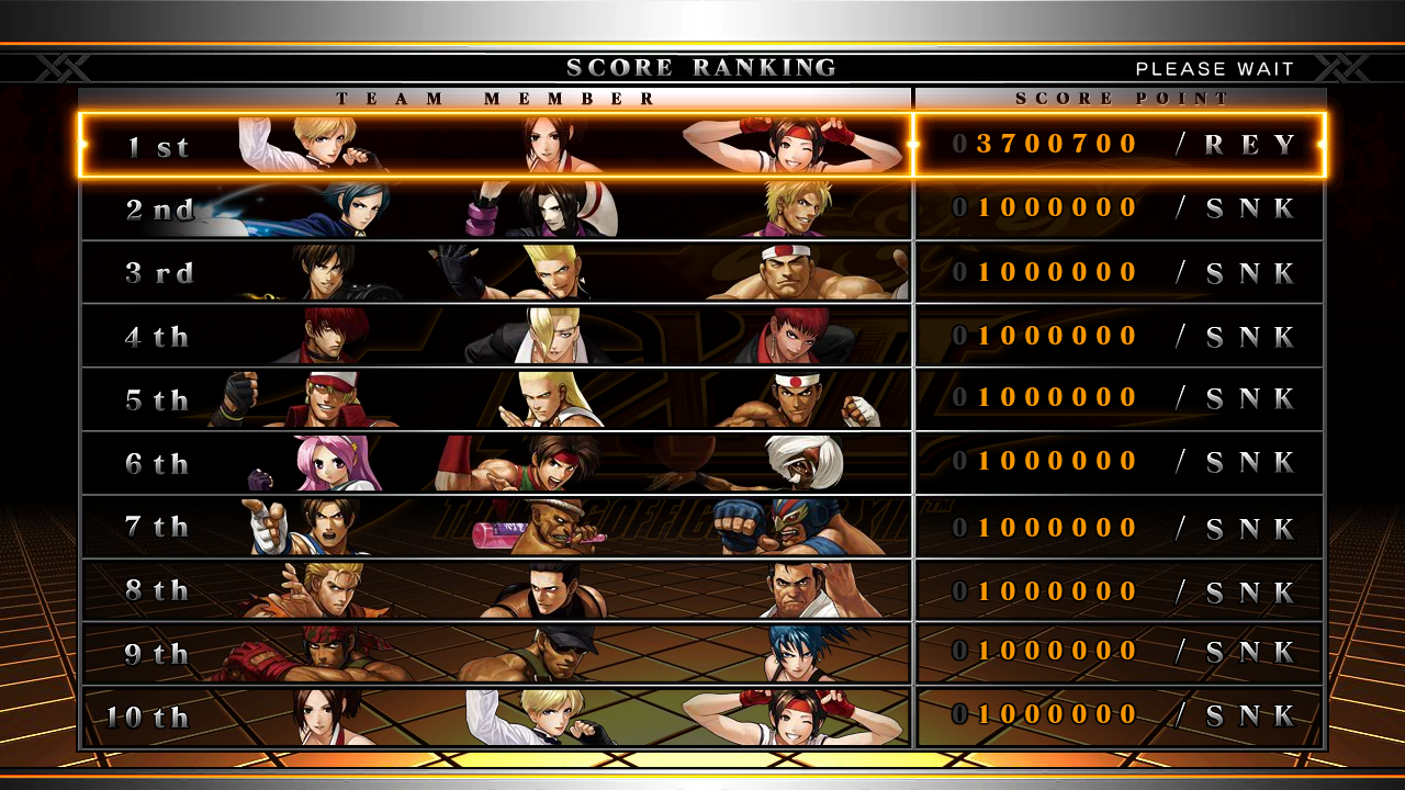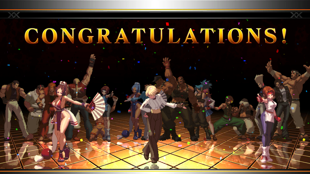 | Japan Team: Kyo, Benimaru, Daimon | Fatal Fury Team: Terry, Andy, Joe | Art of Fighting Team: Ryo, Robert, Takuma | Iori Team: Iori, Vice, Mature | Elisabeth Team: Elisabeth, Duolon, Shen | | Kim Team: Kim, Hwa, Raiden | - Women Fighters Team: King, Mai, Yuri - | K' Team: K', Kula, Maxima | Psycho Soldier Team: Athena, Kensou, Chin | Ikari Warriors Team: Ralf, Clark, Leona | | - Standard Teams - | Special Teams | Team Edit | | - Good Endings - | Bad Ending | |