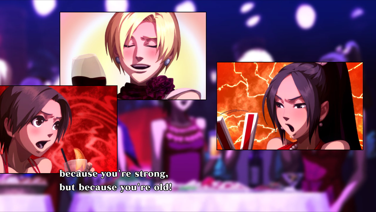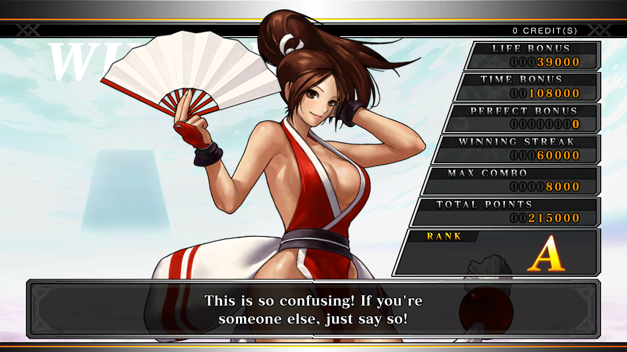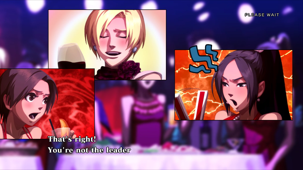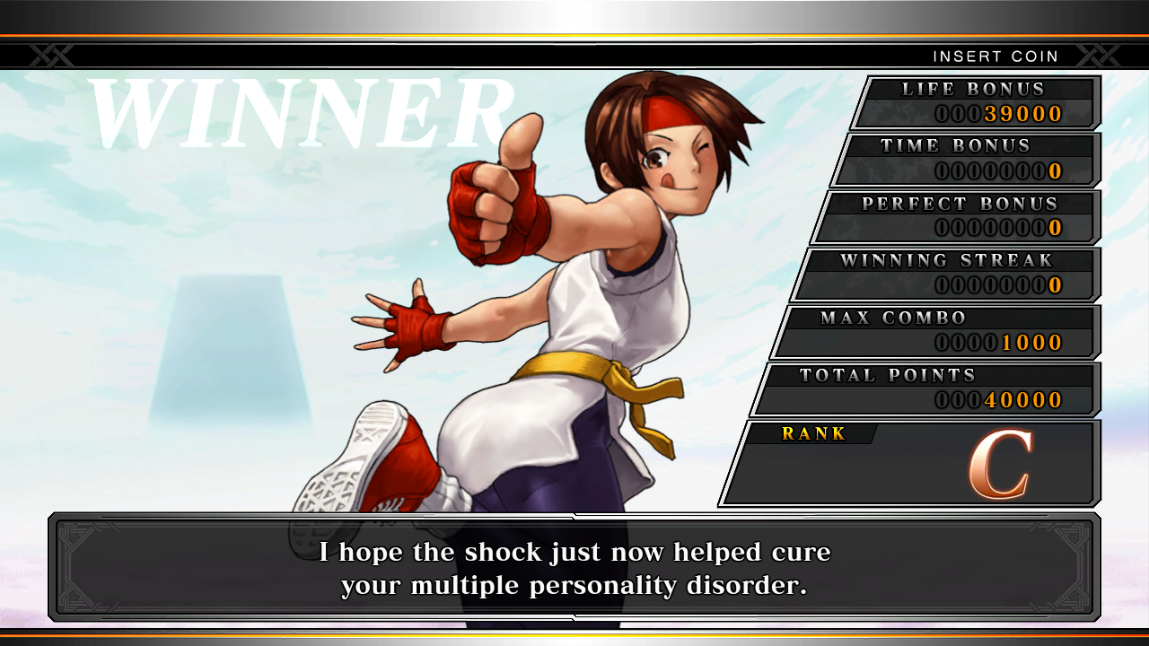 | Japan Team: Kyo, Benimaru, Daimon | Fatal Fury Team: Terry, Andy, Joe | Art of Fighting Team: Ryo, Robert, Takuma | Iori Team: Iori, Vice, Mature | Elisabeth Team: Elisabeth, Duolon, Shen | | Kim Team: Kim, Hwa, Raiden | - Women Fighters Team: King, Mai, Yuri - | K' Team: K', Kula, Maxima | Psycho Soldier Team: Athena, Kensou, Chin | Ikari Warriors Team: Ralf, Clark, Leona | | - Standard Teams - | Special Teams | Team Edit | | - Good Endings - | Bad Ending | |