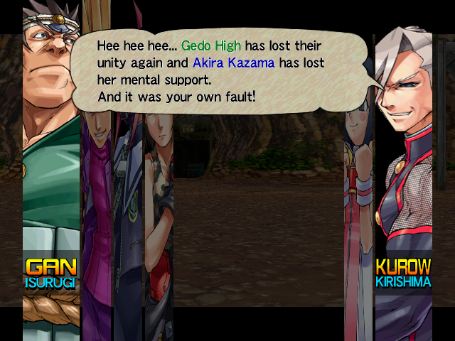 | Home | BackTweet | - Arcade - | Tournament Battle | | - Story Mode - | Free Mode | | Taiyo Gakuen High School | Gorin High School | Pacific High School | - Gedo High School - | | Justice High School | Seijyun Jyogakuin High School | Dark Side Student Council | | Good Ending | - Bad Ending - |