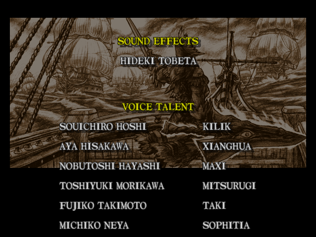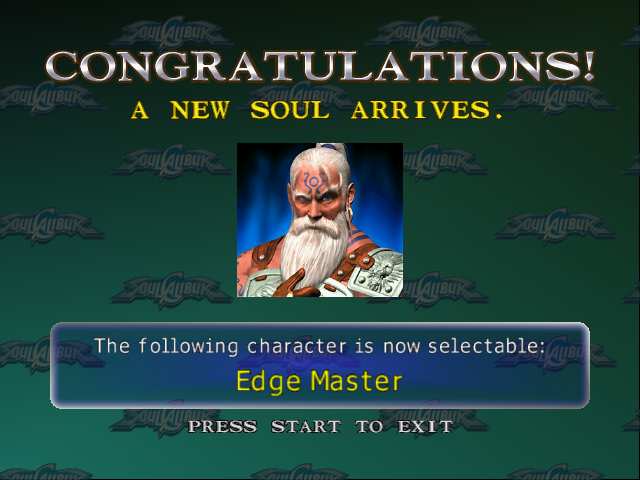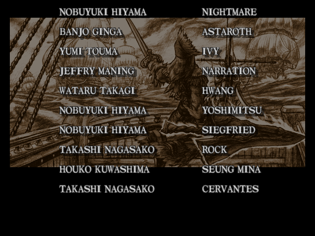 | Mitsurugi | Voldo | Ivy | Sophitia | Kilik | Xianghua | Maxi | Nightmare | Taki | Astaroth | Hwang | | Yoshimitsu | Lizardman | Siegfried | Rock | Seung Mina | - Cervantes - | Edge Master | Inferno | |