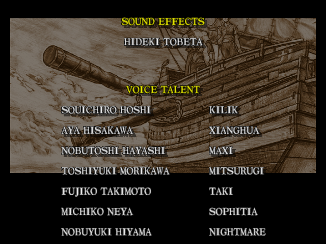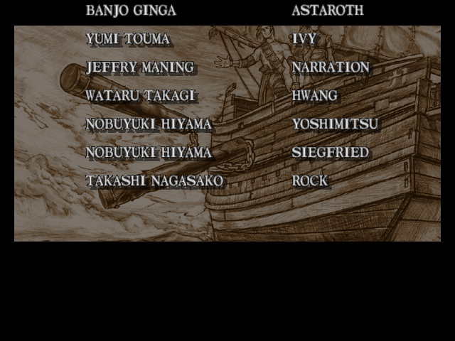 | Mitsurugi | Voldo | Ivy | Sophitia | Kilik | Xianghua | - Maxi - | Nightmare | Taki | Astaroth | Hwang | | Yoshimitsu | Lizardman | Siegfried | Rock | Seung Mina | Cervantes | Edge Master | Inferno | |