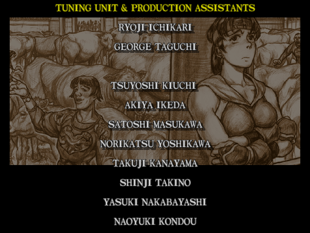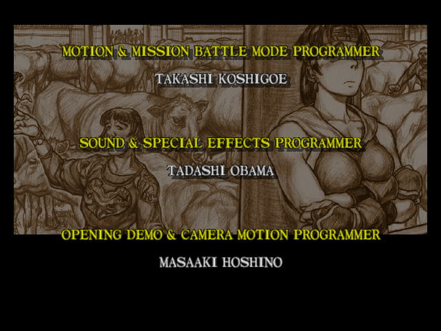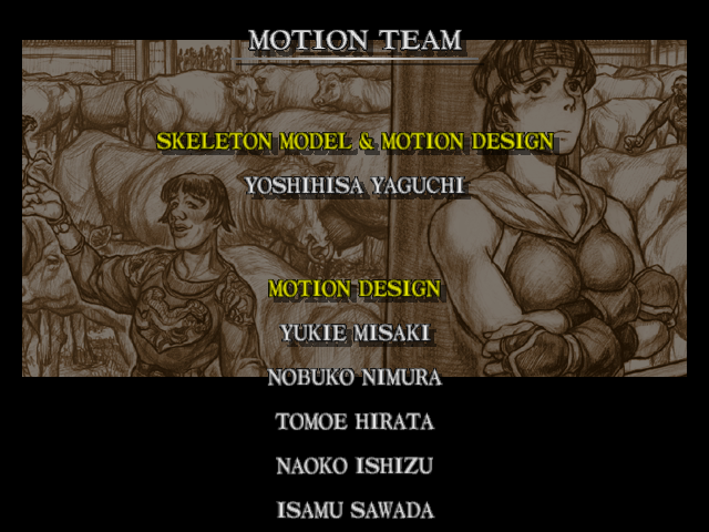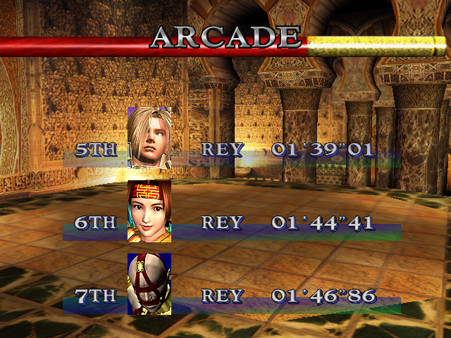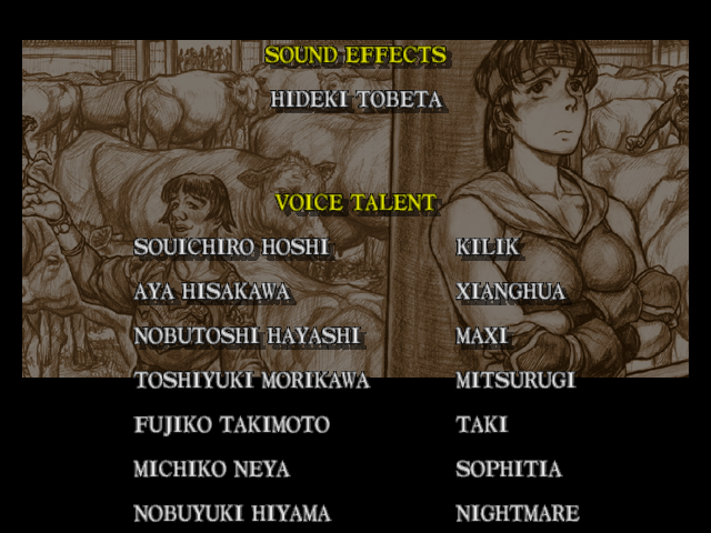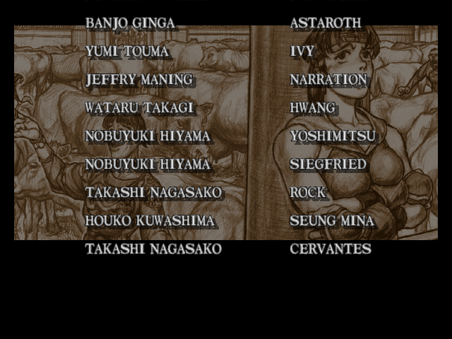 | Mitsurugi | Voldo | Ivy | Sophitia | Kilik | Xianghua | Maxi | Nightmare | Taki | Astaroth | Hwang | | Yoshimitsu | Lizardman | Siegfried | Rock | - Seung Mina - | Cervantes | Edge Master | Inferno | |
