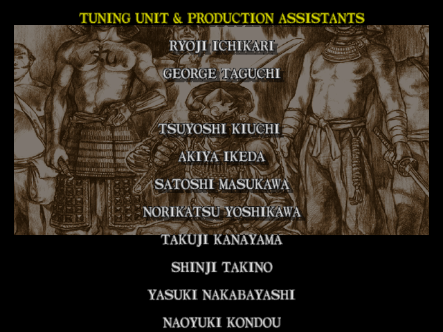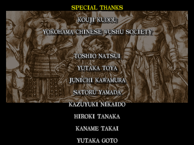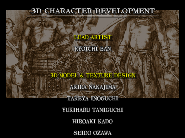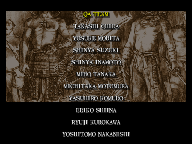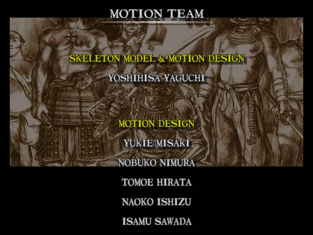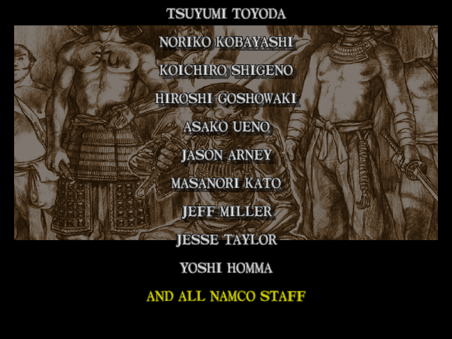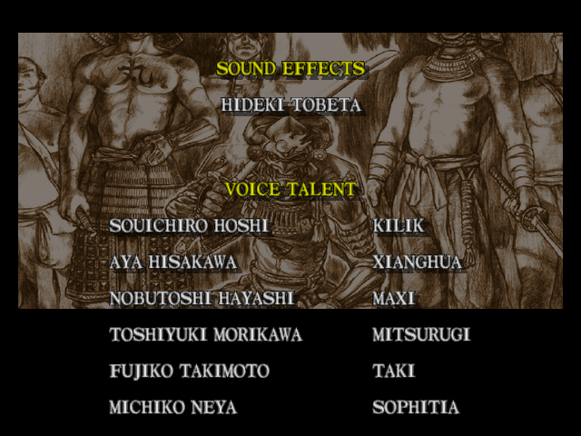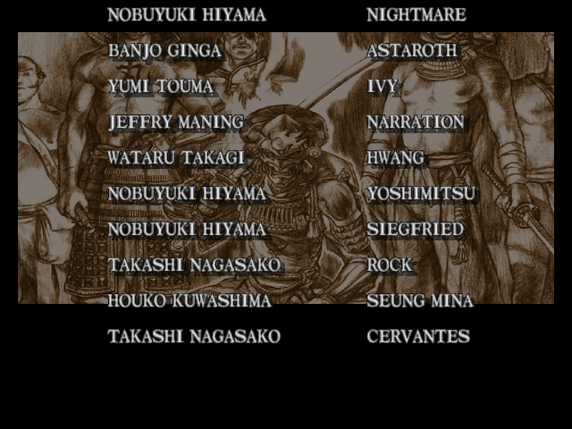 | Mitsurugi | Voldo | Ivy | Sophitia | Kilik | Xianghua | Maxi | Nightmare | Taki | Astaroth | Hwang | | - Yoshimitsu - | Lizardman | Siegfried | Rock | Seung Mina | Cervantes | Edge Master | Inferno | |