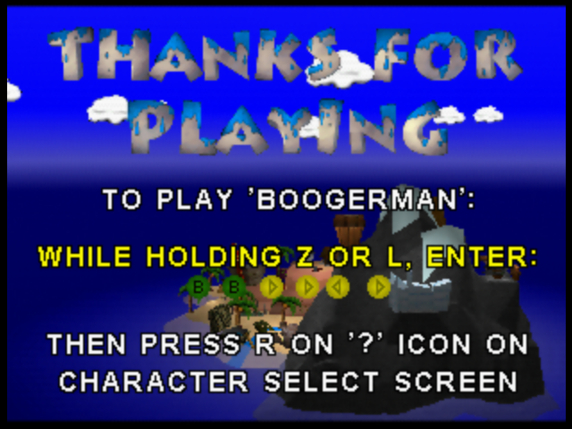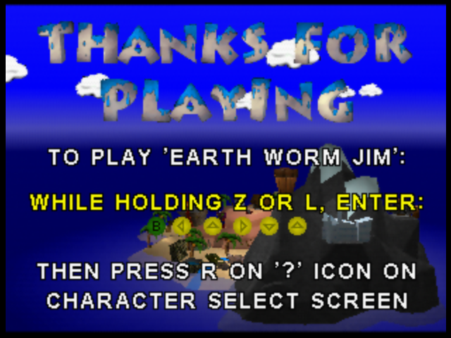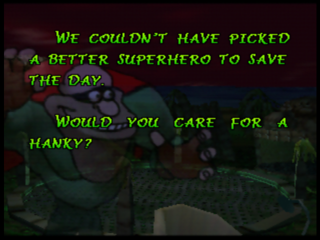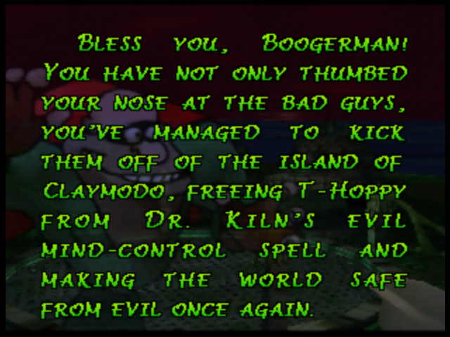 If The Difficulty Was Below "Psycho" If No Secret Character Has Been Unlocked ("Psycho" Difficulty) If Earth Worm Jim Has Been Unlocked ("Psycho" Difficulty) If Earth Worm Jim, & Boogerman Have Been Unlocked ("Psycho" Difficulty) If Earth Worm Jim, Boogerman, & Sumo Santa, Have Been Unlocked ("Psycho" Difficulty) If Every Secret Character Has Been Unlocked ("Psycho" Difficulty)